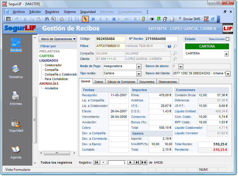 La carga de trabajo diaria en una correduría de seguros se centra principalmente en la gestión de recibos, es por ello que SegurLIF facilita las tareas de cobro, devolución, liquidación, remesado, carga de cartera y contabilización de los recibos.
